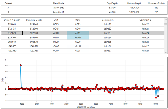 PRISM Downhole Item Identification automatically finds all the completion items in the survey data. It reports the depths of these items, which gives an analyst the input and output depths, allowing Clarity™ to report the depth correction pairs that are required to shift the data to the depth reference.